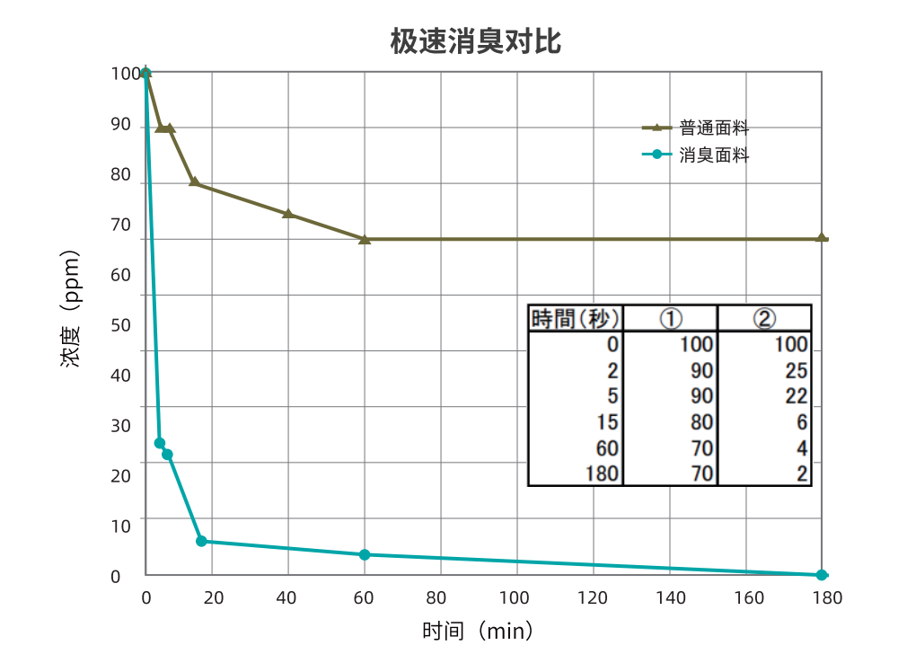 針對(duì)氨臭(汗臭和腥臊臭、腳臭)等臭味,10秒達(dá)到95%以上,1分鐘達(dá)99%以上,是活性炭分解速度的20倍,分解量的150倍