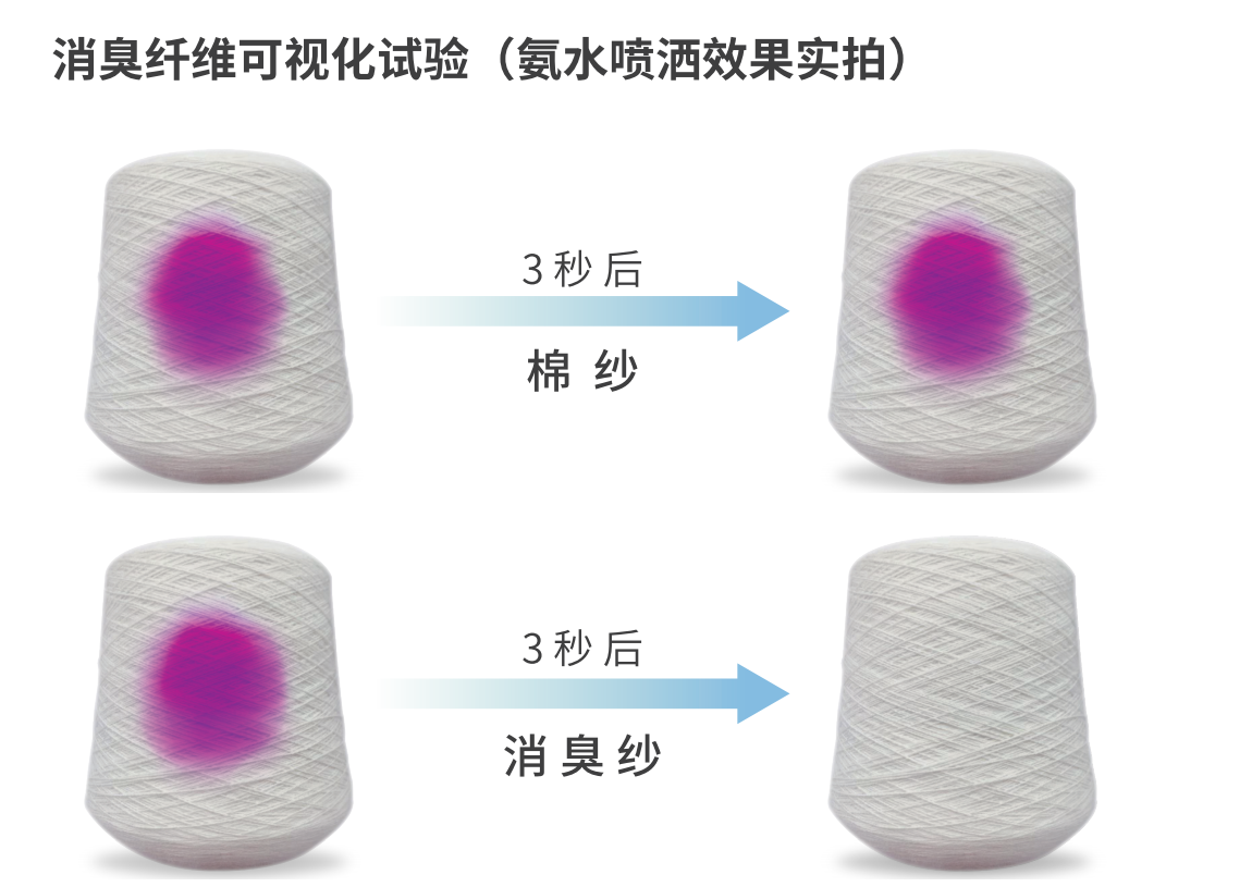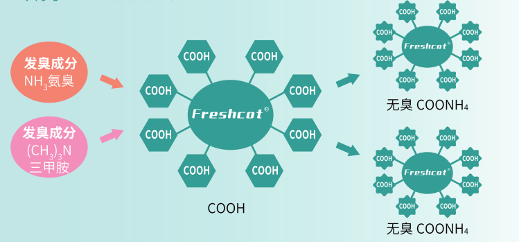 極細(xì)的海藻生物消臭因子通過改性,均勻反應(yīng)到天然纖維分子鏈上(如棉花、纖維素纖維等)形成具有可視化長(zhǎng)期效果的超強(qiáng)消臭多功能纖維。消臭纖維上大量的COOH羧基,通過中和、分解反應(yīng)去除酸性和堿性異味。