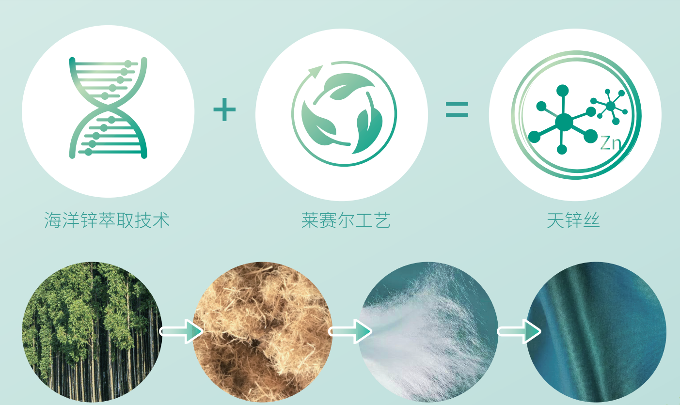 海洋生物萃取工藝和鋅科技相融合,從富含鋅元素的海洋生物中提取有機(jī)鋅,通過(guò)大分子接枝改性技術(shù)反應(yīng)到含有大量羥基-OH和-NH3胺基等基團(tuán)的天然纖維分子鏈上,然后生產(chǎn)出具有安全0溶出、永久耐洗性的抗菌抗病毒含鋅高科技天然健康纖維。