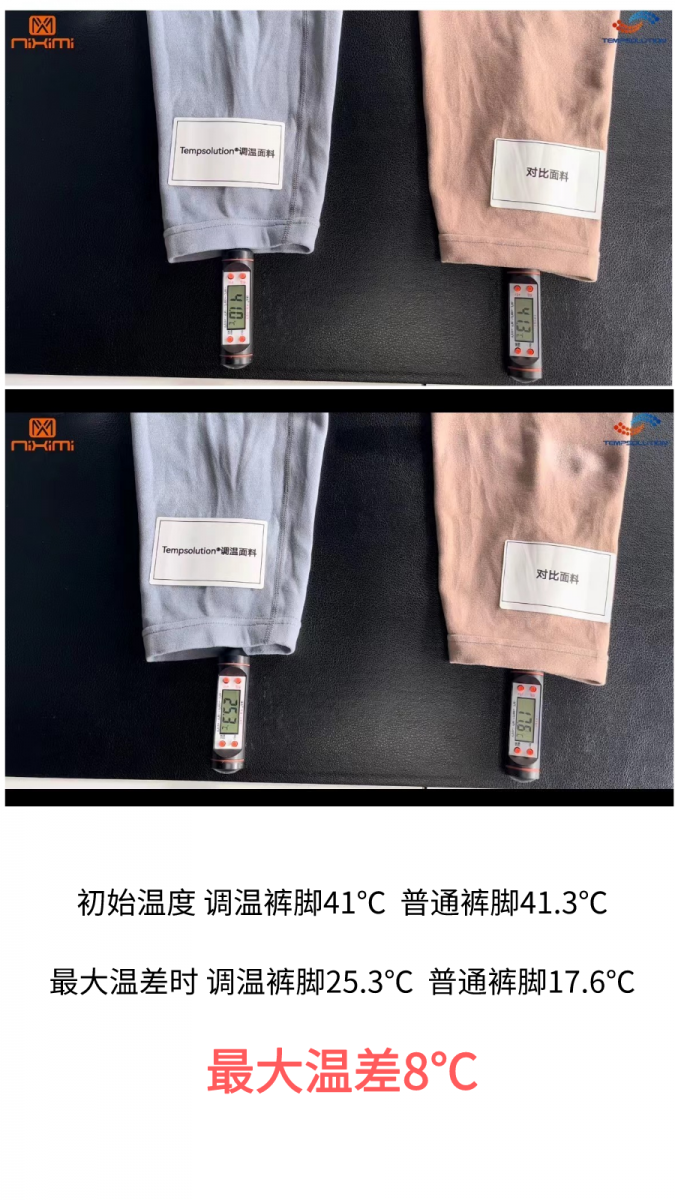 如下分別為Tempsolution®調(diào)溫面料所進(jìn)行的升溫以及降溫對(duì)比實(shí)驗(yàn),可以看到溫差最大高達(dá)8℃。