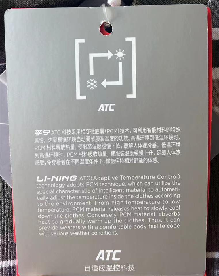 李寧自適應(yīng)溫控T恤采用尼希米Tempsolution®調(diào)溫纖維,采用相變微膠囊(PCM)技術(shù),根據(jù)環(huán)境智能調(diào)節(jié)溫度,緩解人體驟冷感和熱感,自適應(yīng)不同溫差,都可保持舒適體感。